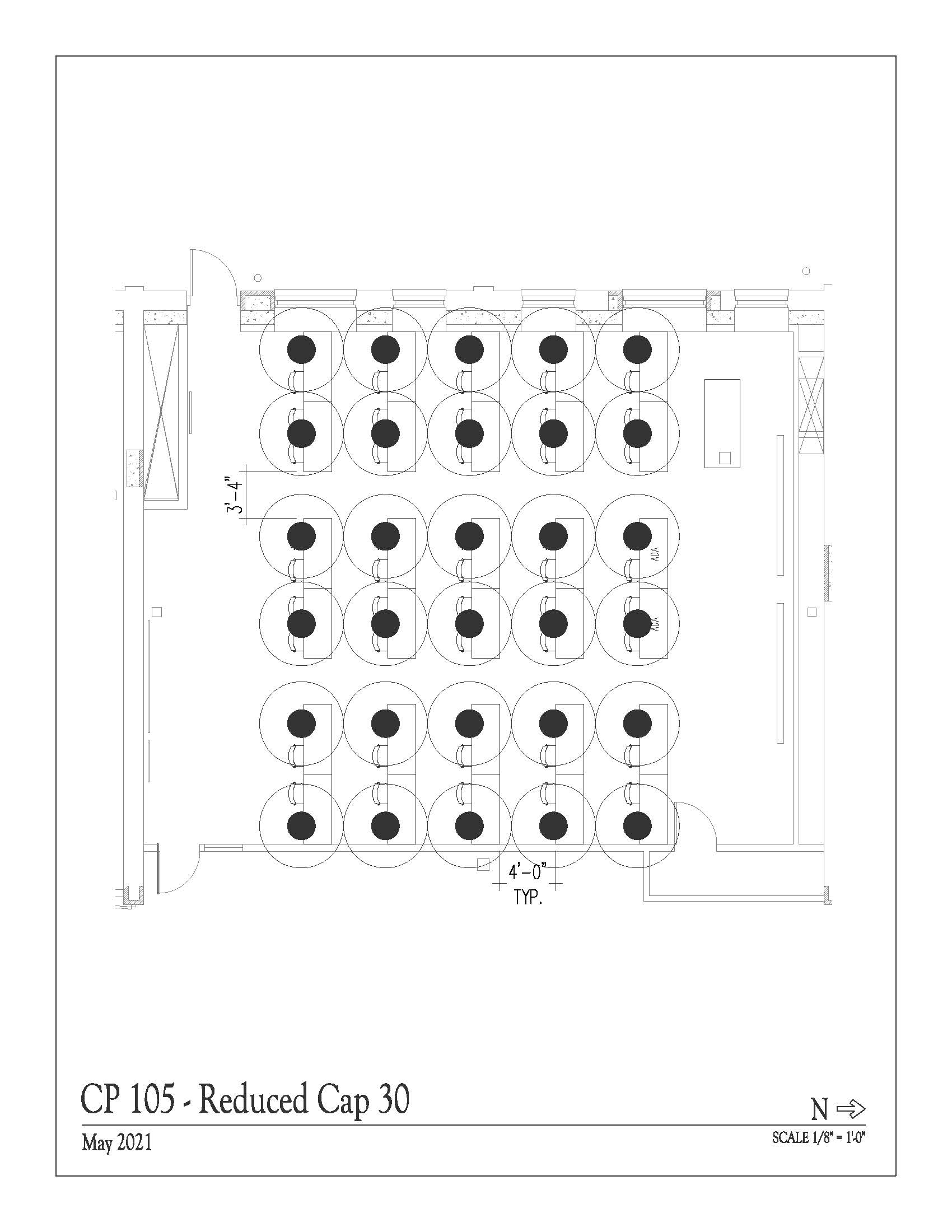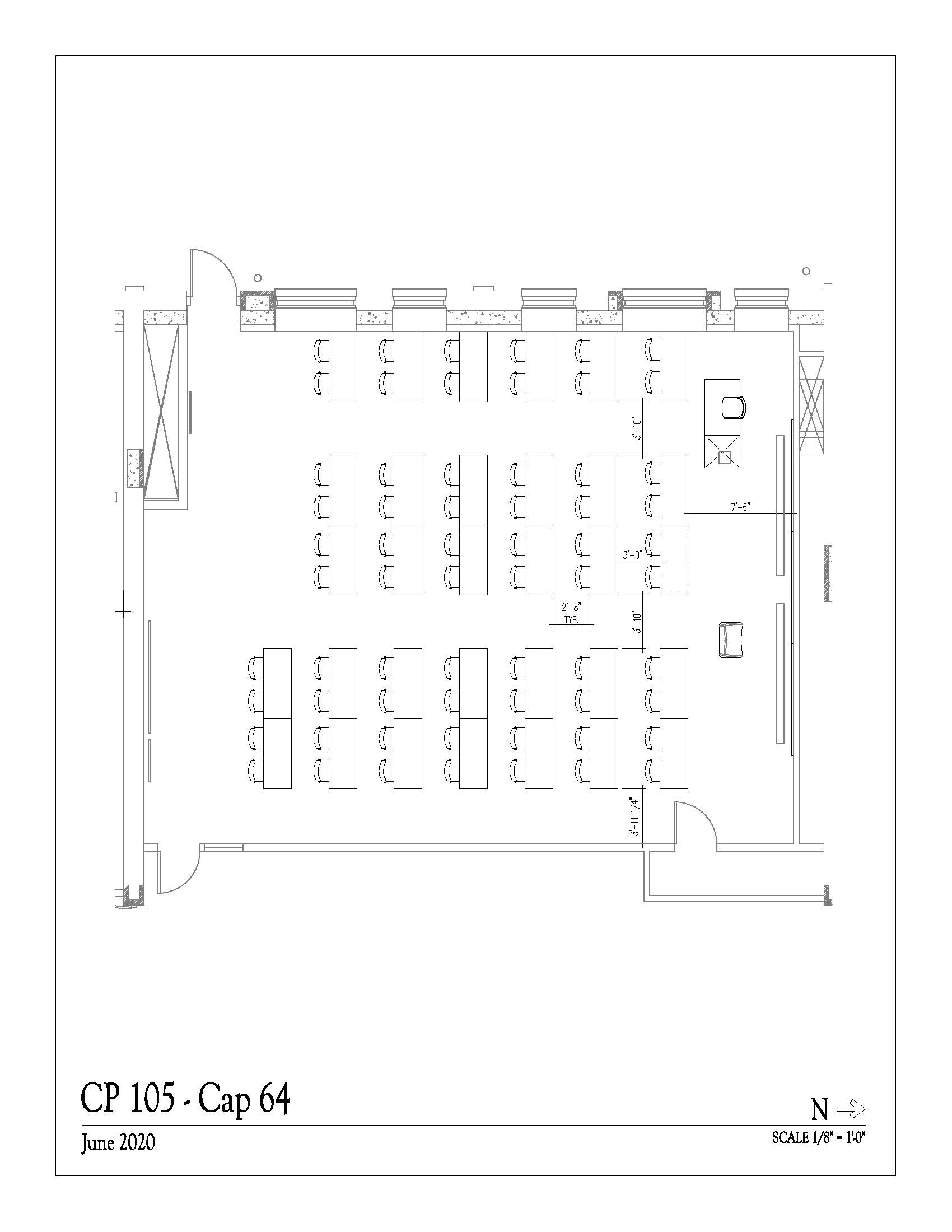 CP 105 is a classroom in Cherry Parkes. It has a maximum capacity of 64 people. This space is subject to the quarterly scheduling timeline, which gives the highest scheduling priority to University courses. The space is scheduled by the Office of the Registrar.