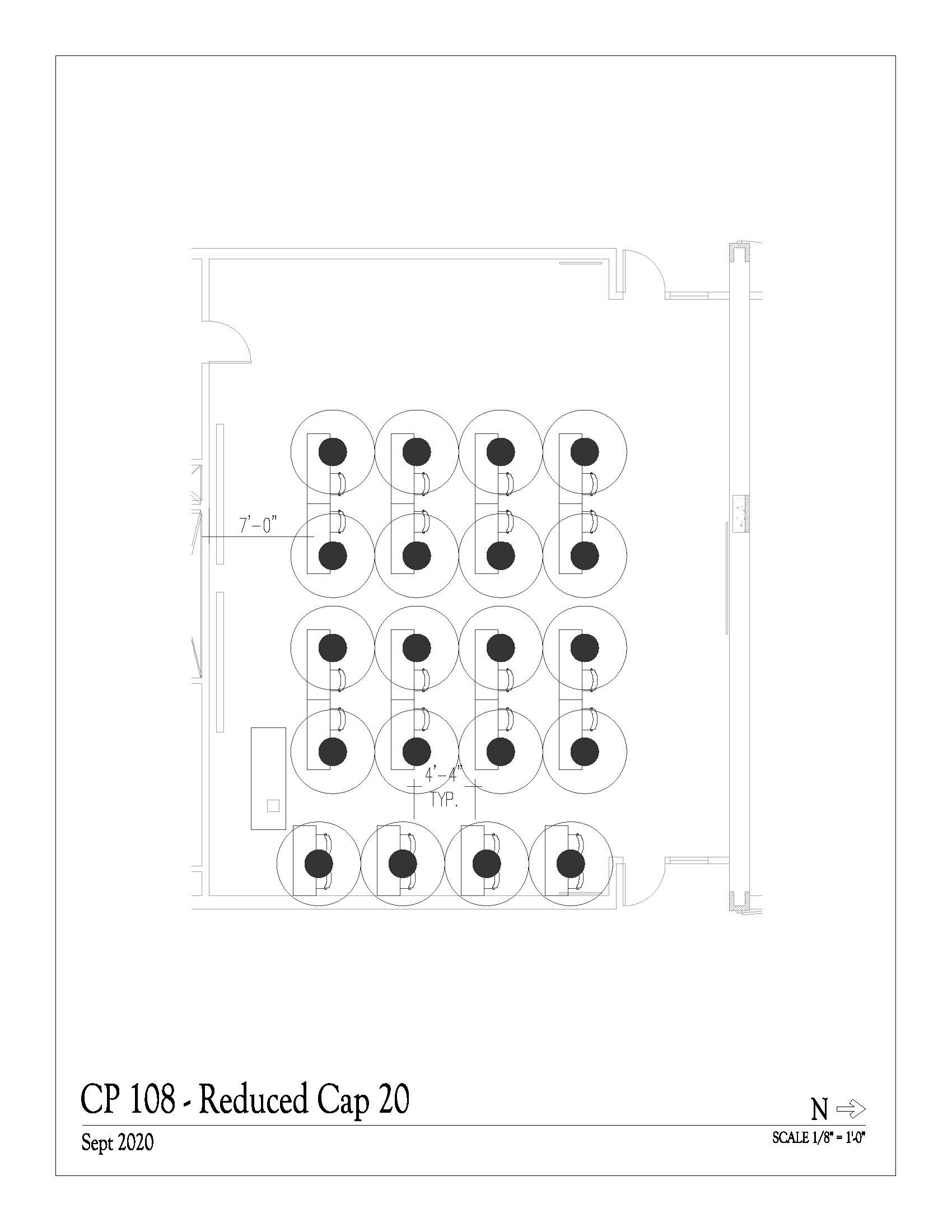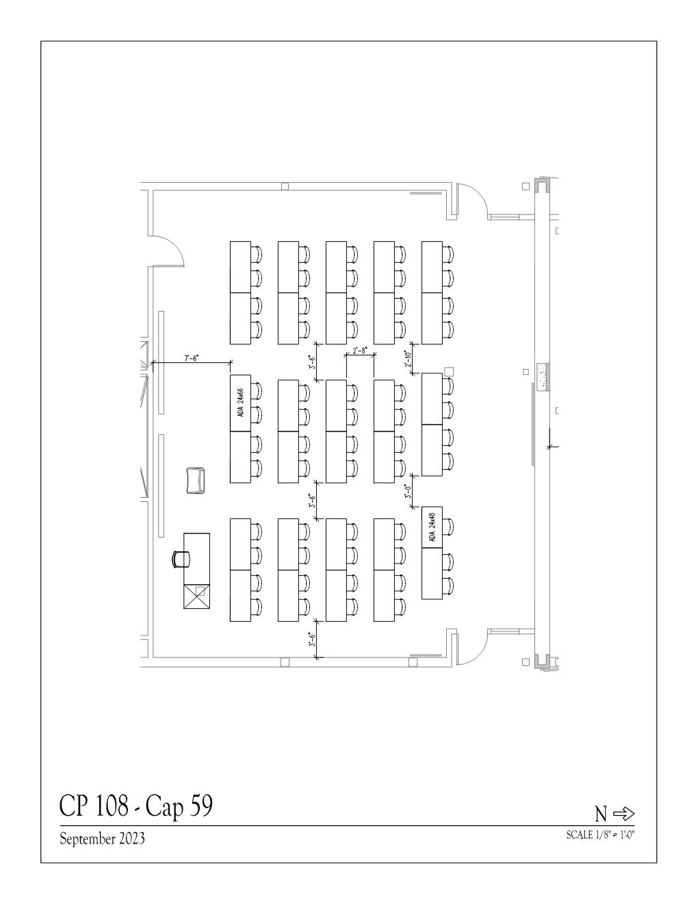 CP 108 is a classroom in Cherry Parkes. It has a maximum capacity of 59 people. This space is subject to the quarterly scheduling timeline, which gives the highest scheduling priority to University courses. The space is scheduled by the Office of the Registrar.