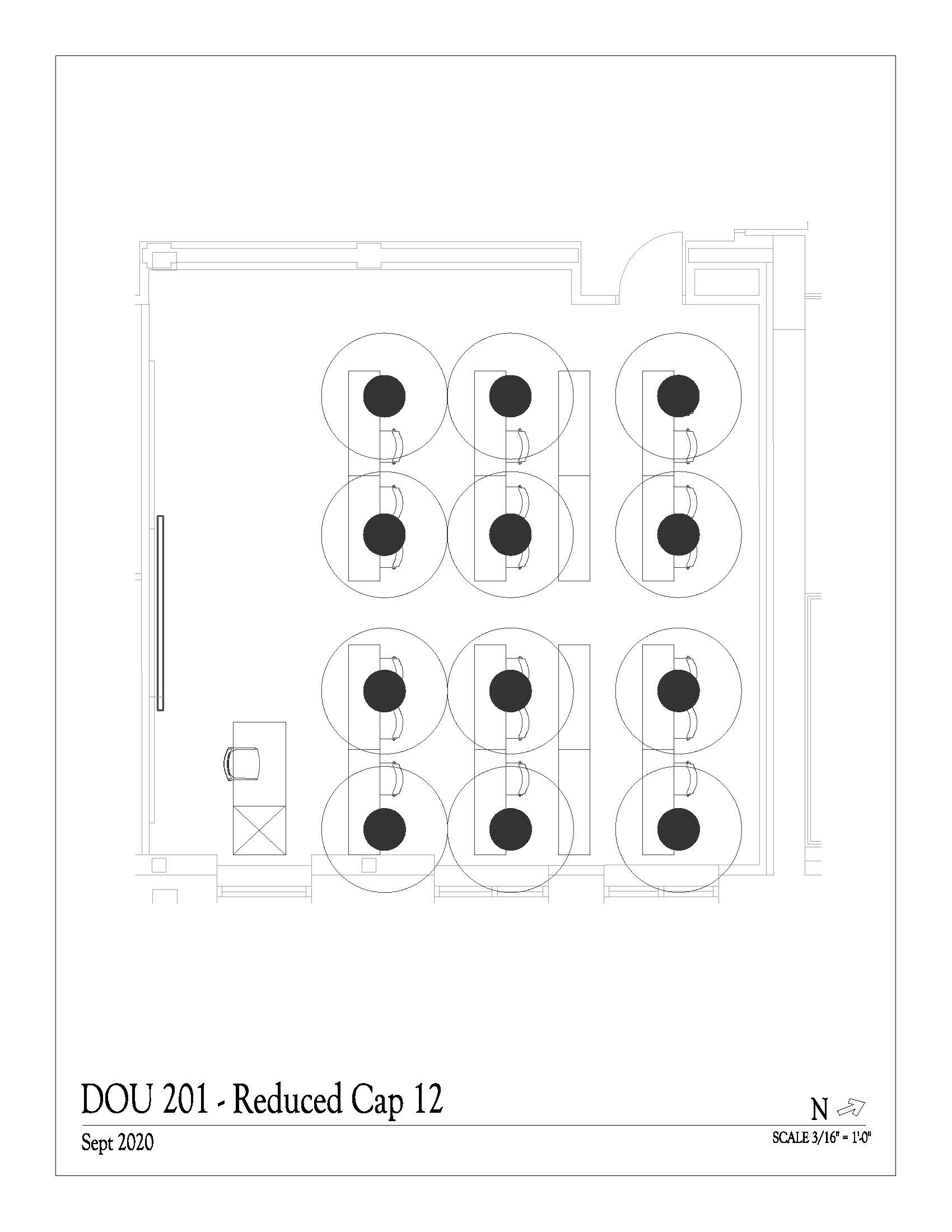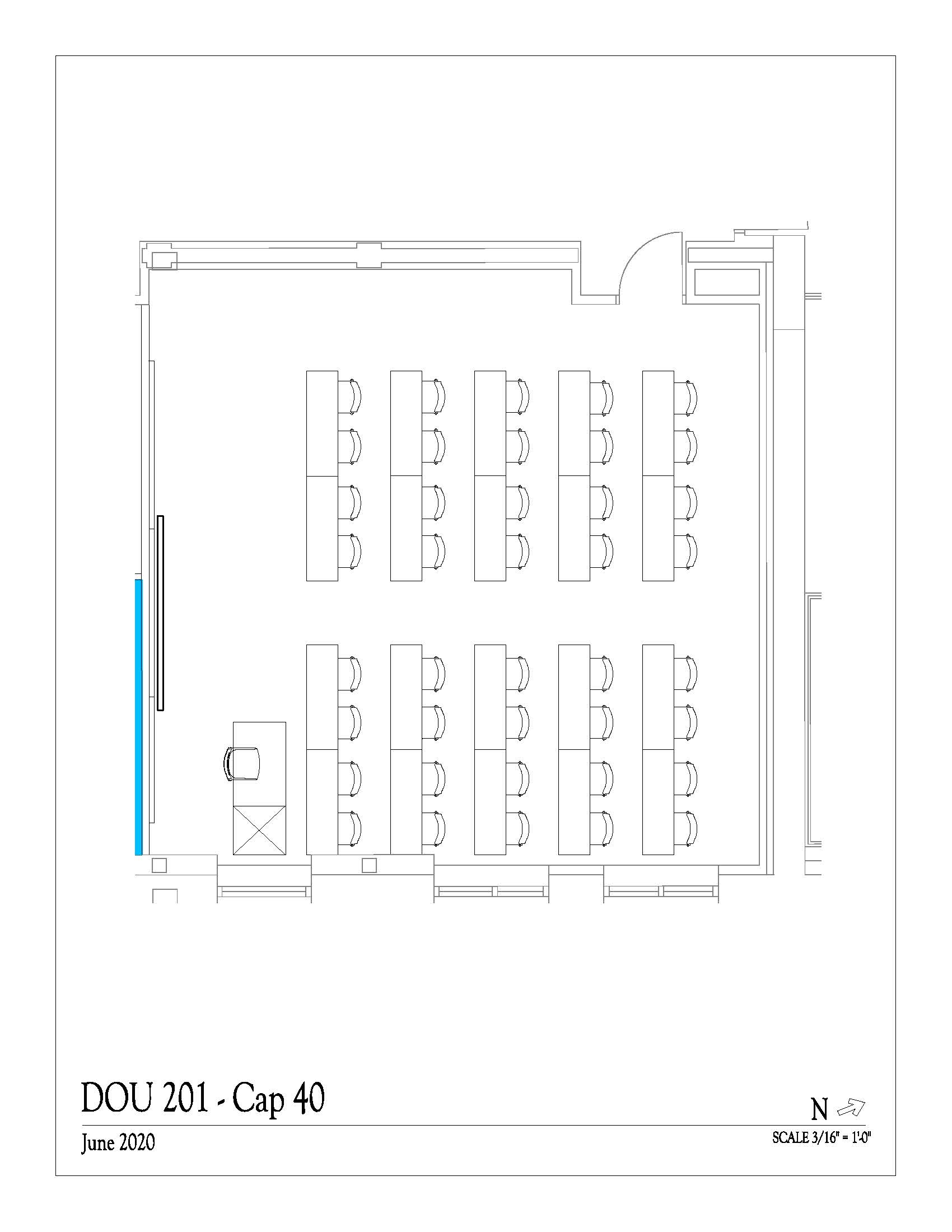 DOU 201 is a classroom in the Dougan building. It has a maximum capacity of 40 people. This space is subject to the quarterly scheduling timeline, which gives the highest scheduling priority to University courses. The space is scheduled by the Office of the Registrar.