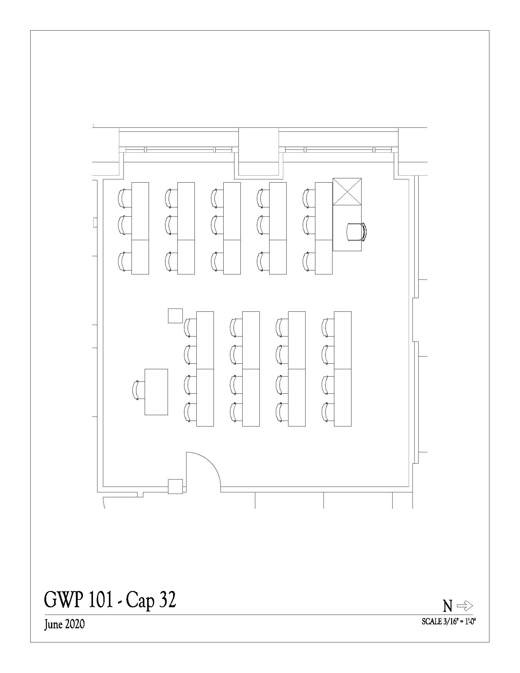 GWP 101 is a classroom in the Garretson Woodruff & Pratt building. It has a maximum capacity of 32 people. This space is subject to the quarterly scheduling timeline, which gives the highest scheduling priority to University courses. The space is scheduled by the Office of the Registrar.