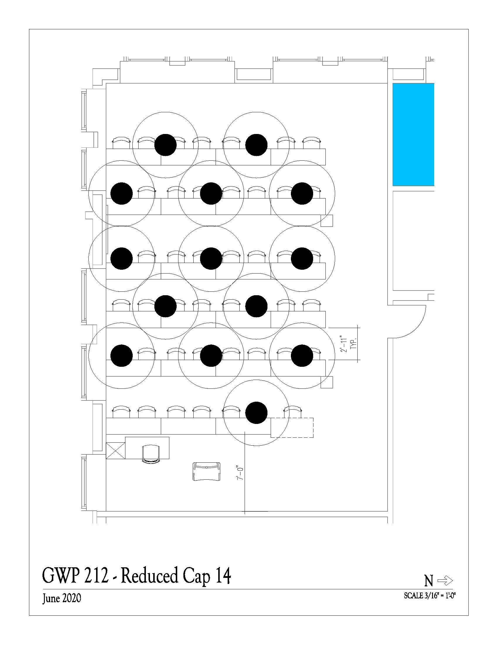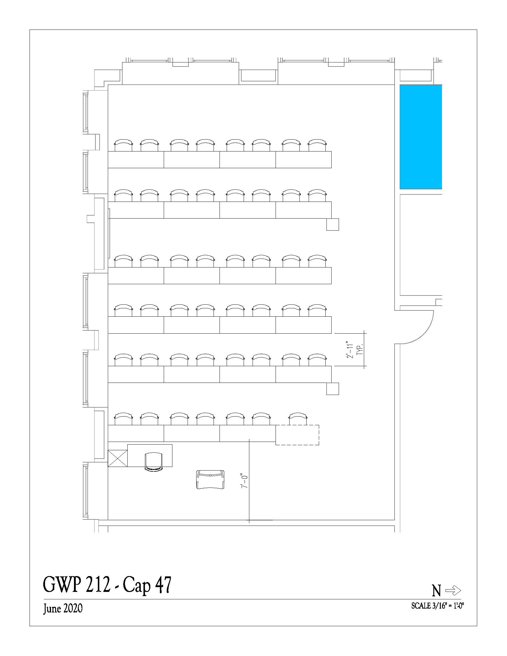 GWP 212 is a classroom in the Garretson Woodruff & Pratt building. It has a maximum capacity of 47 people. This space is subject to the quarterly scheduling timeline, which gives the highest scheduling priority to University courses. The space is scheduled by the Office of the Registrar.