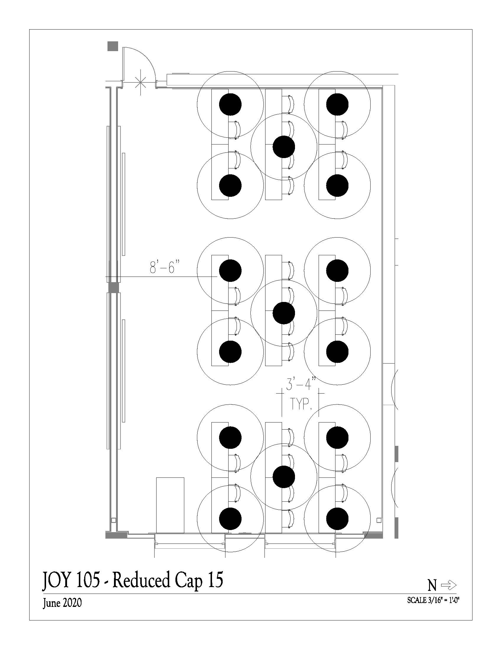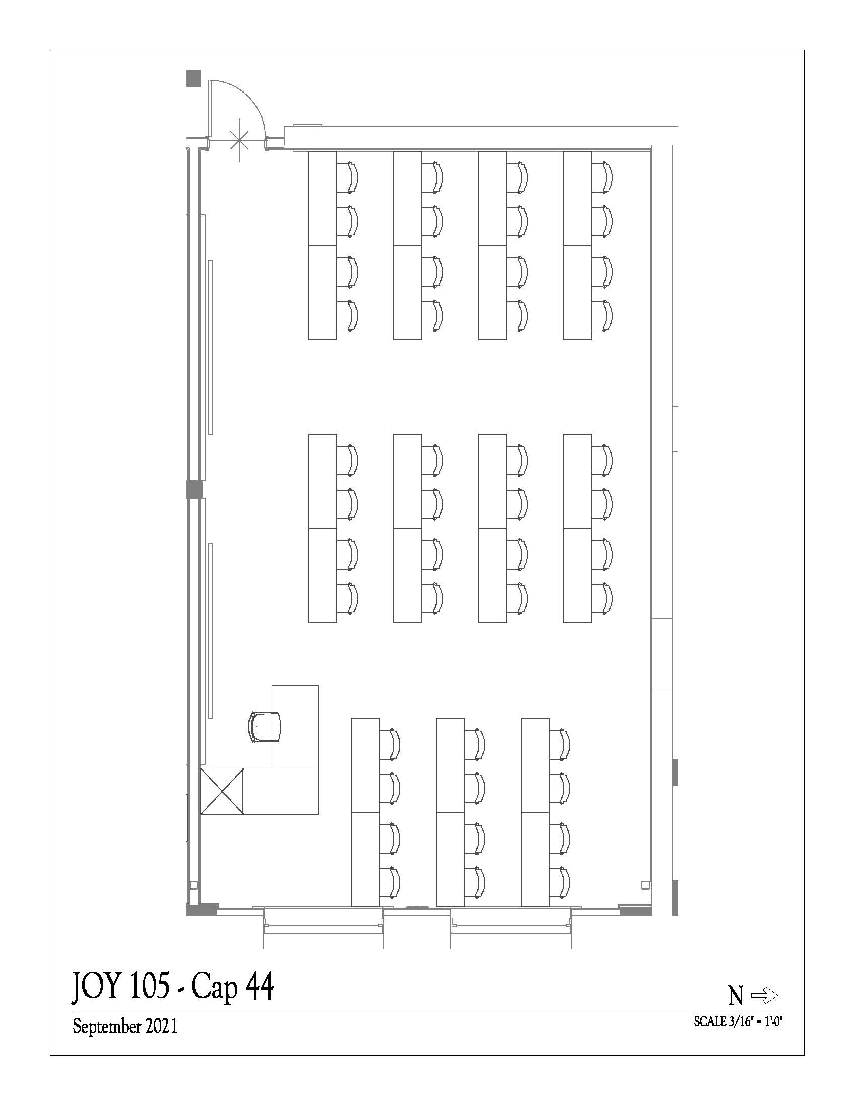 JOY 105 is a classroom in the Russell T. Joy building. It has a maximum capacity of 44 people. This space is subject to the quarterly scheduling timeline, which gives the highest scheduling priority to University courses. The space is scheduled by the Office of the Registrar.