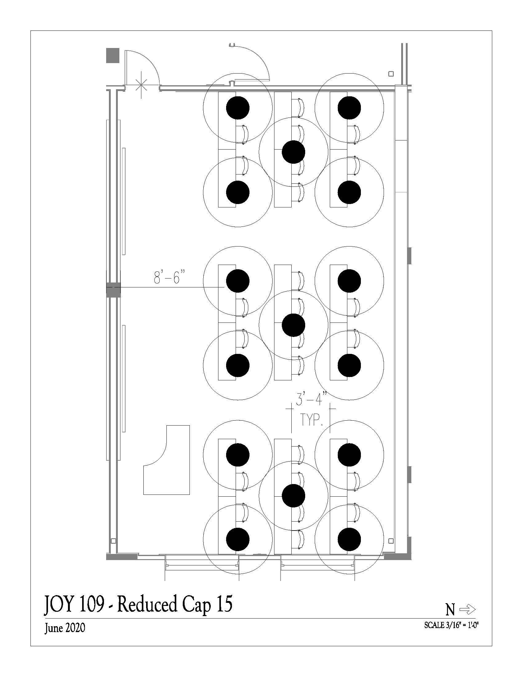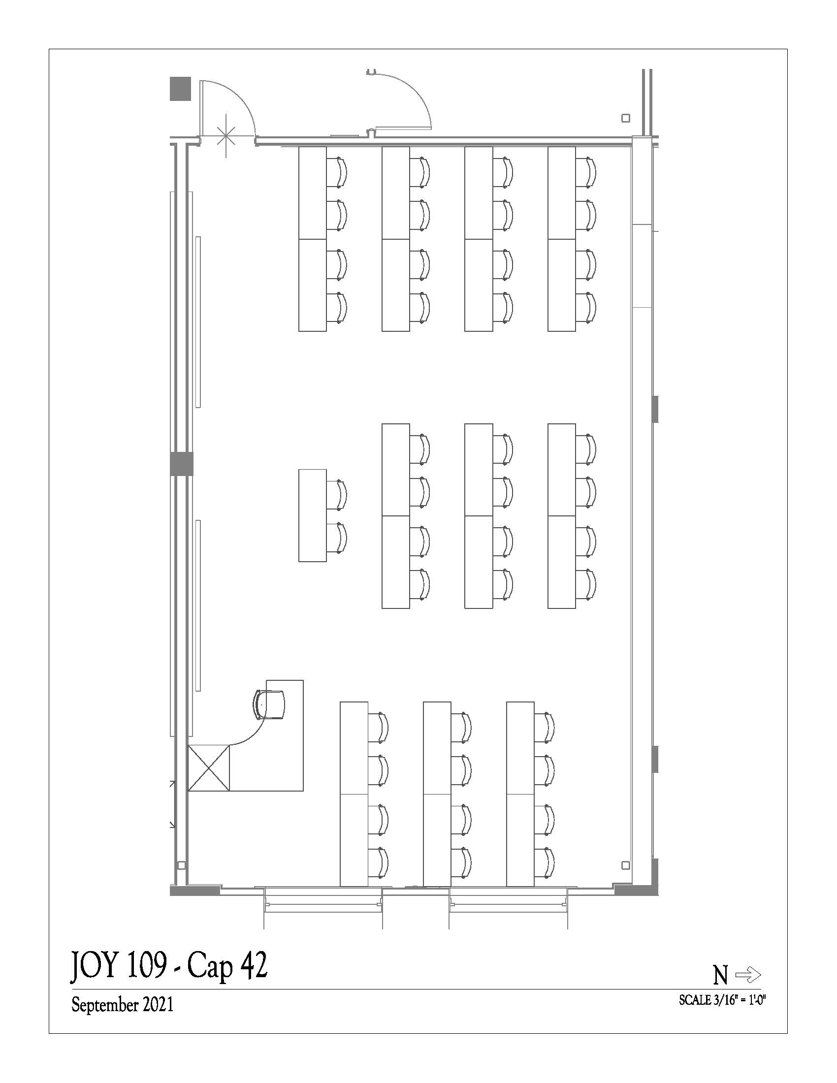JOY 109 is a classroom in the Russell T. Joy building. It has a maximum capacity of 42 people. This space is subject to the quarterly scheduling timeline, which gives the highest scheduling priority to University courses. The space is scheduled by the Office of the Registrar.