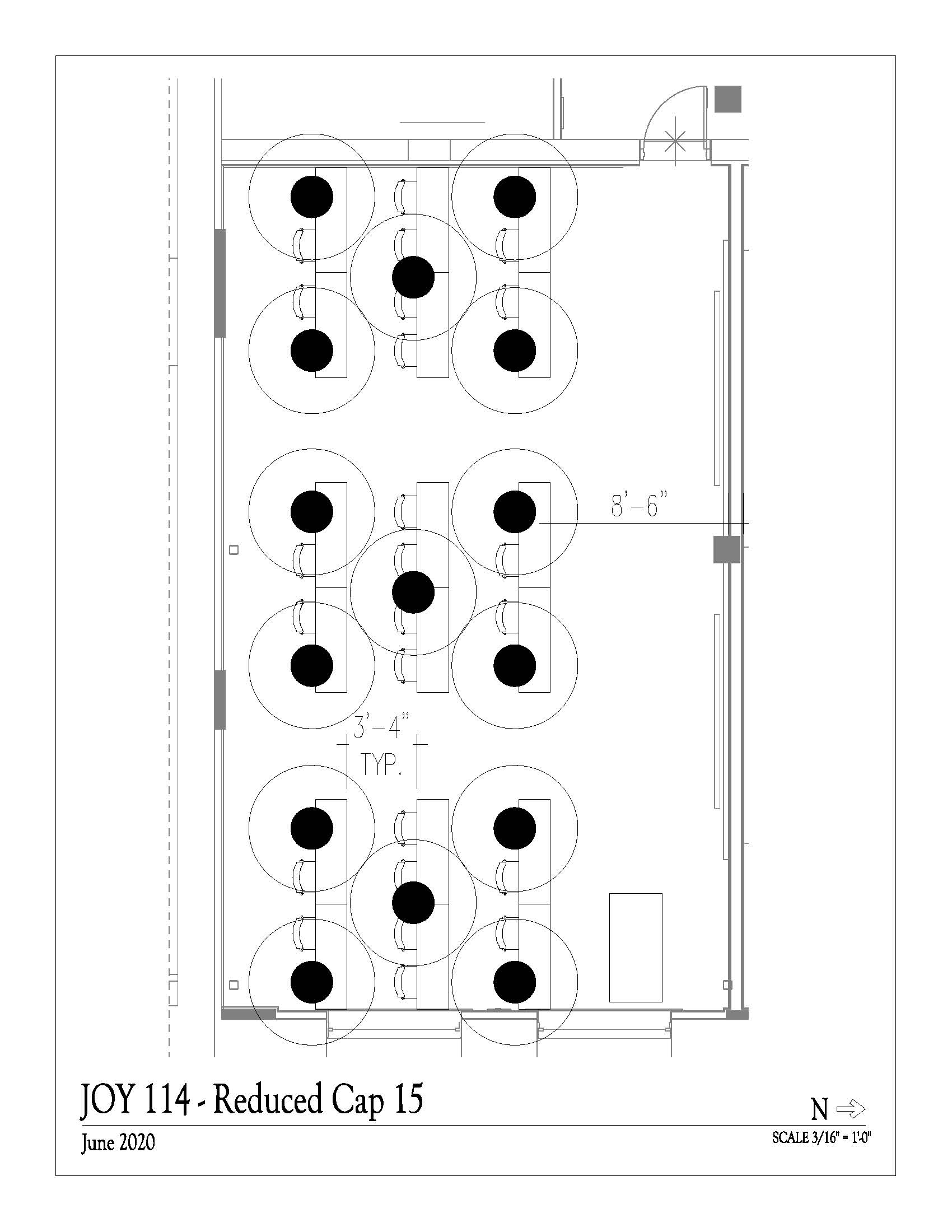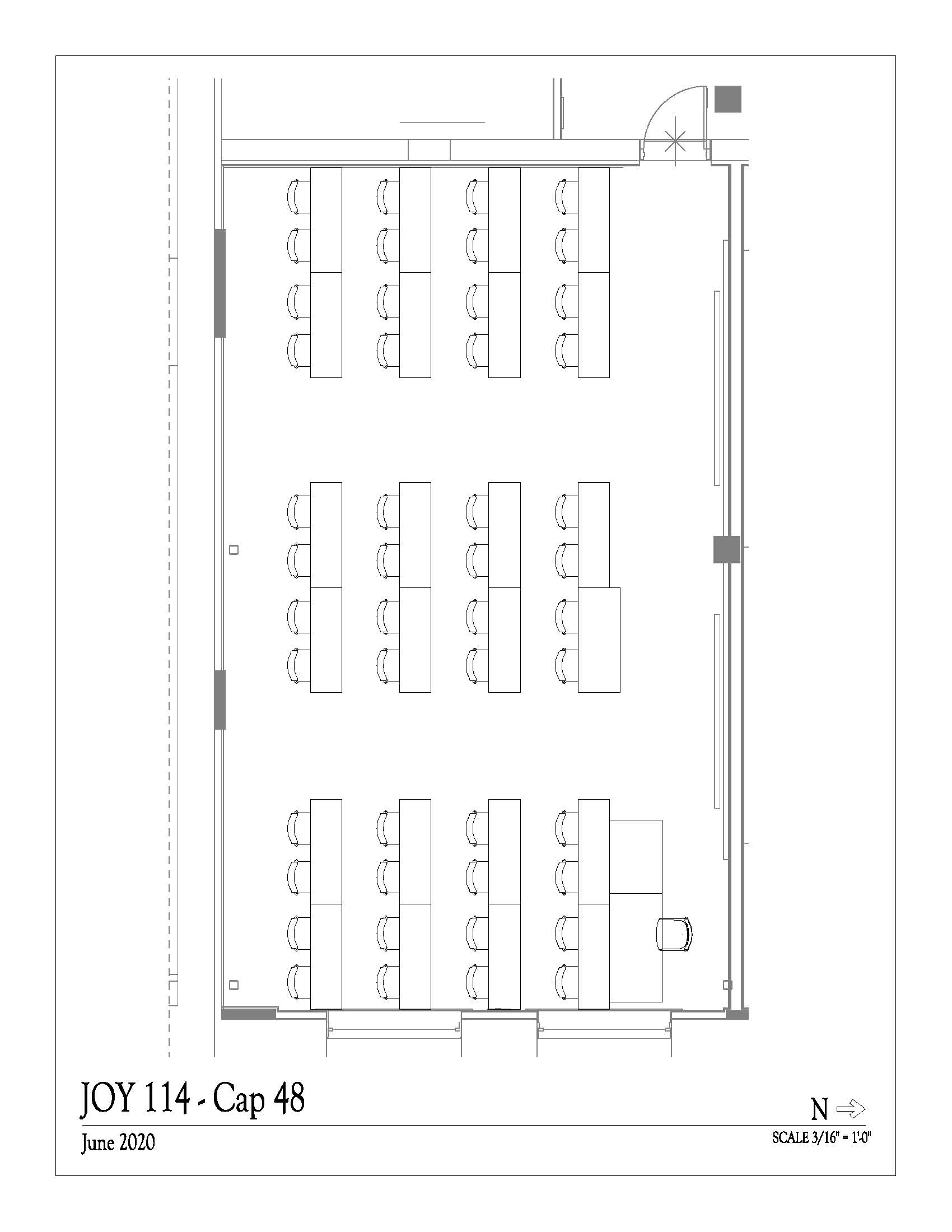 JOY 114 is a classroom in the Russell T. Joy building. It has a maximum capacity of 48 people. This space is subject to the quarterly scheduling timeline, which gives the highest scheduling priority to University courses. The space is scheduled by the Office of the Registrar.