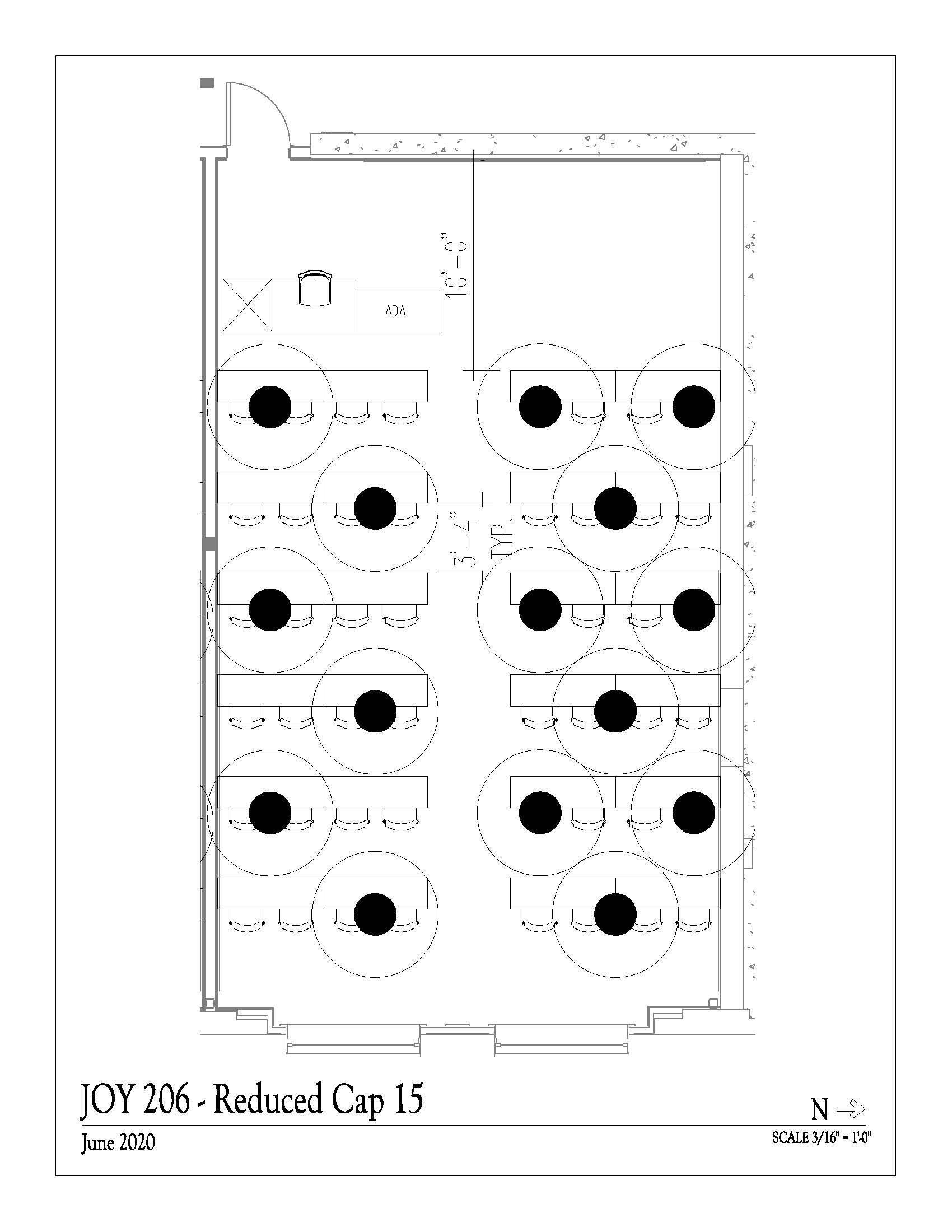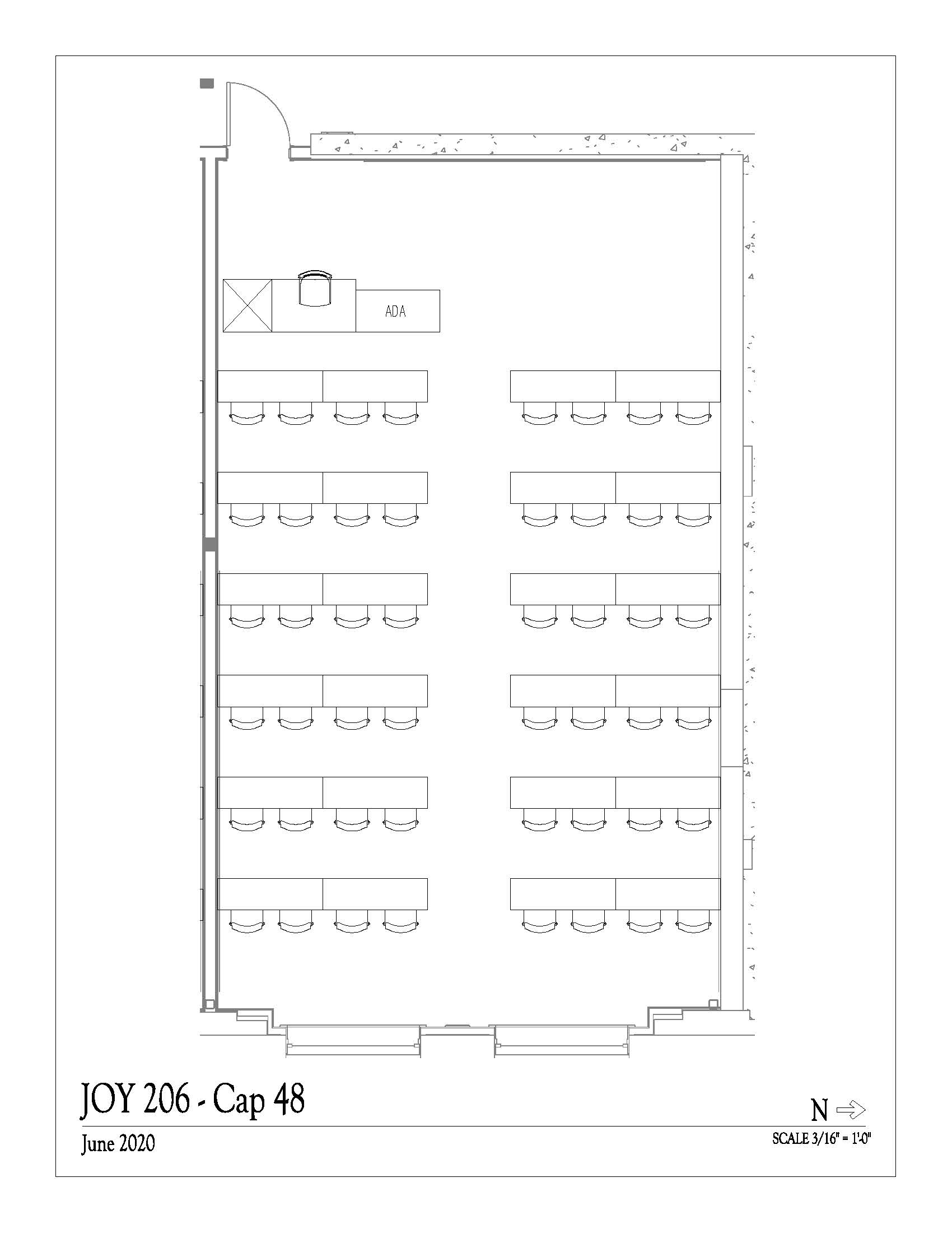 JOY 206 is a classroom in the Russell T. Joy building. It has a maximum capacity of 48 people. This space is subject to the quarterly scheduling timeline, which gives the highest scheduling priority to University courses. The space is scheduled by the Office of the Registrar.