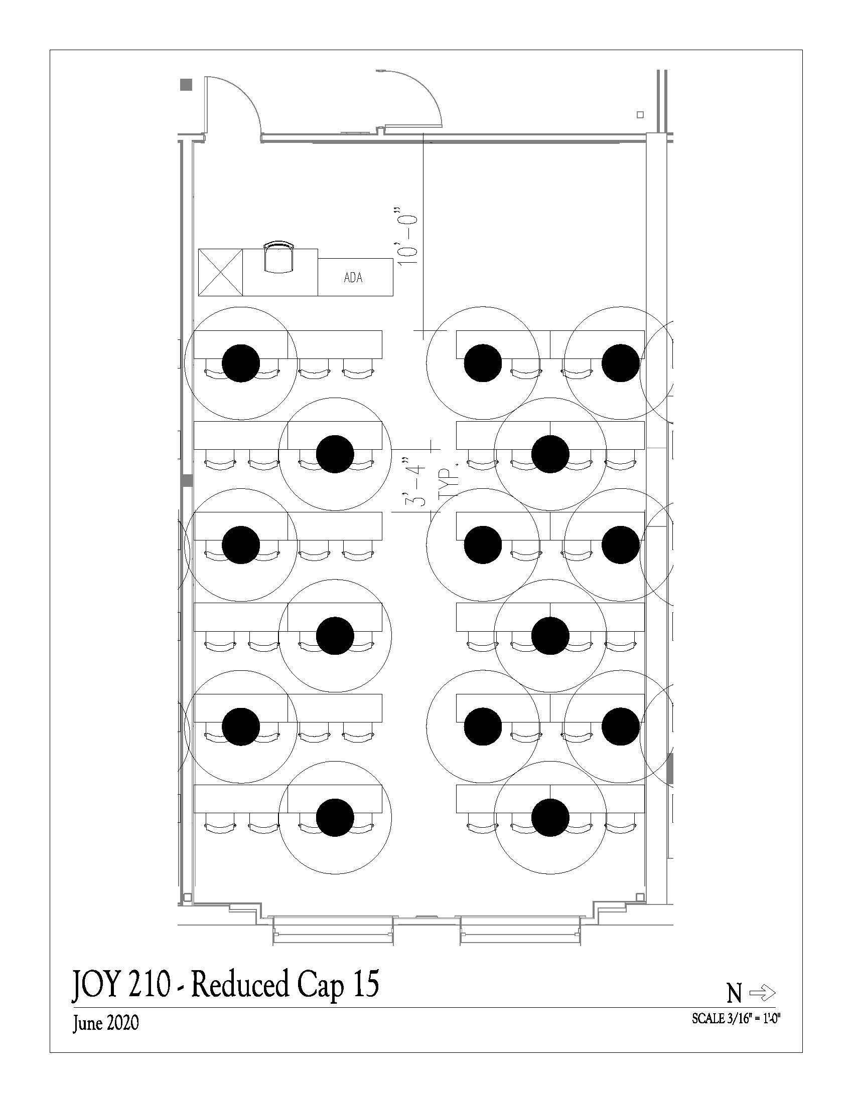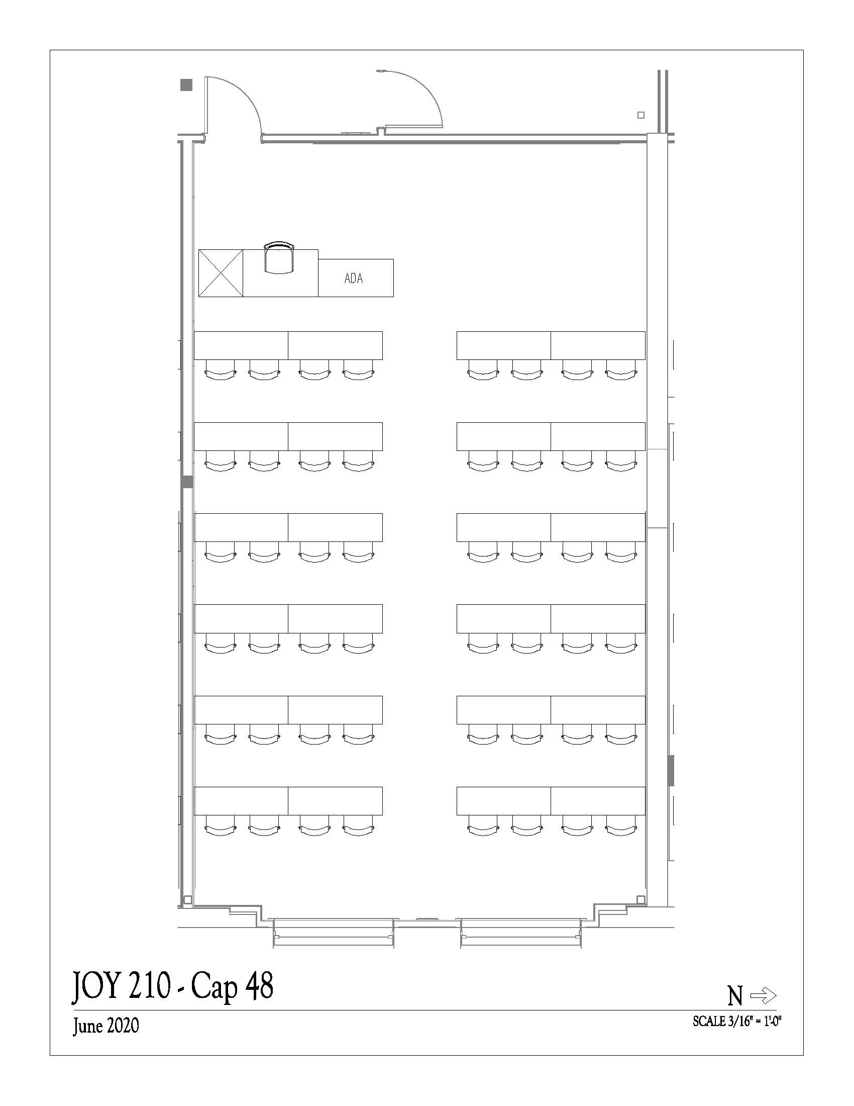JOY 210 is a classroom in the Russell T. Joy building. It has a maximum capacity of 48 people. This space is subject to the quarterly scheduling timeline, which gives the highest scheduling priority to University courses. The space is scheduled by the Office of the Registrar.
