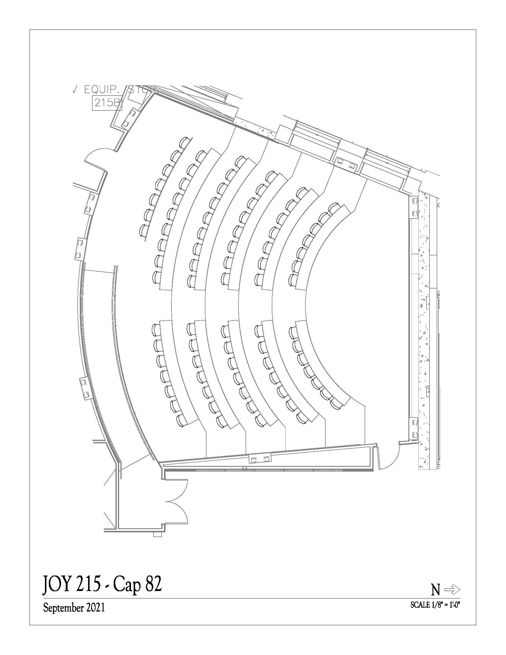 JOY 215 is a classroom in the Russell T. Joy building. It has a maximum capacity of 81 people. This space is subject to the quarterly scheduling timeline, which gives the highest scheduling priority to University courses. The space is scheduled by the Office of the Registrar.